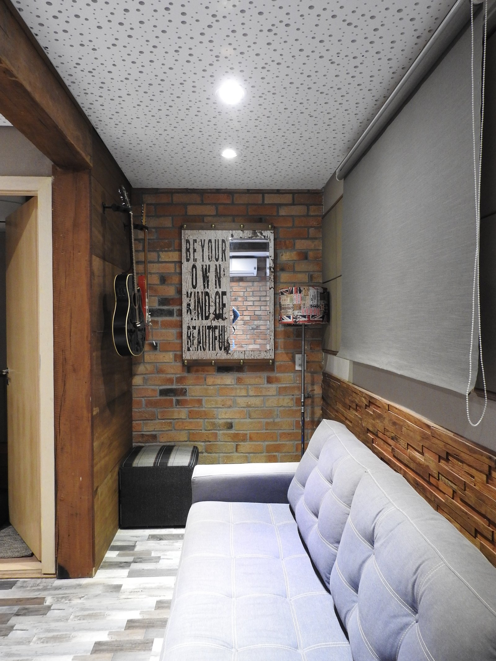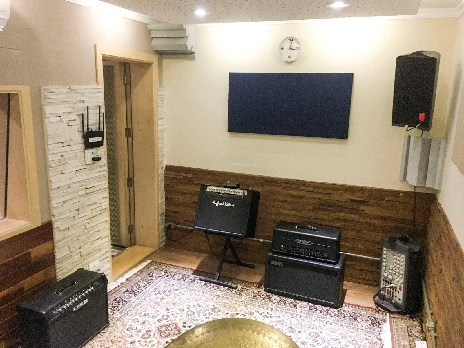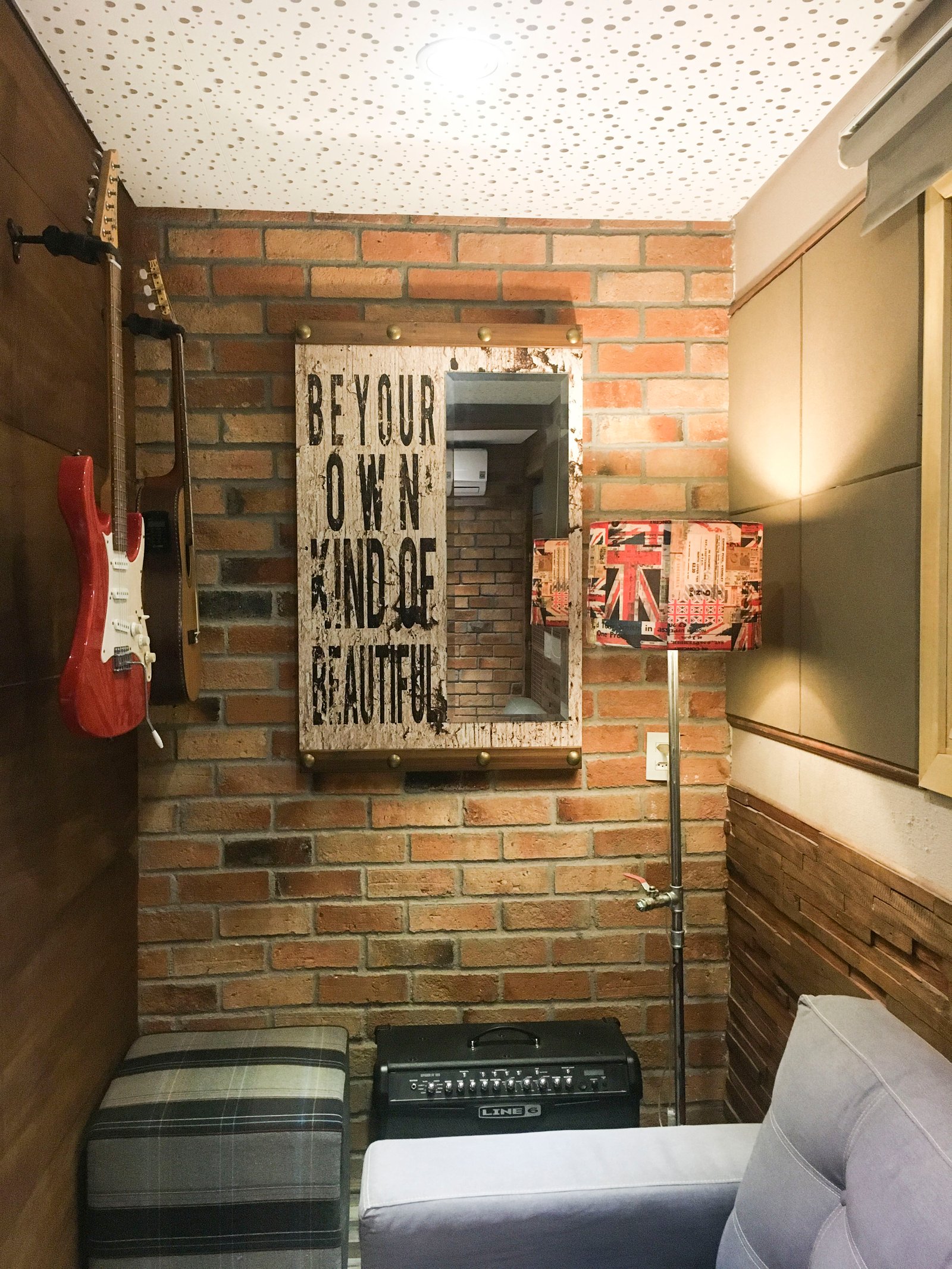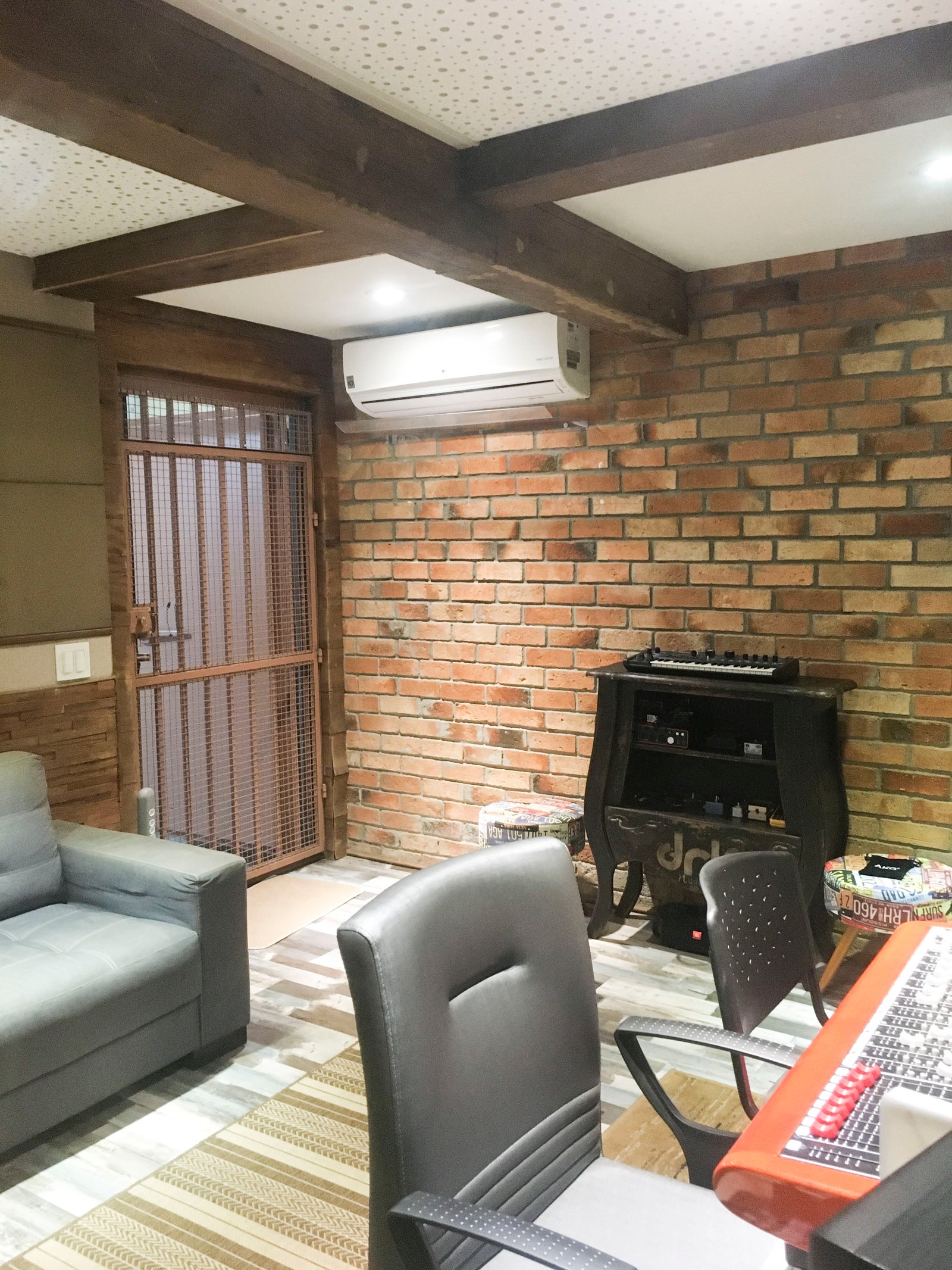 A cabine de voz foi projetada para interações fluidas. Com isolamento acústico e 2 visores, o vocalista se comunica visualmente com a sala técnica e o estúdio ao mesmo tempo.